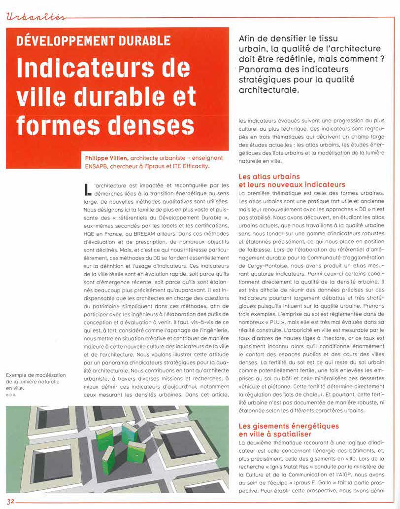 C'est dans ce cadre que nous avons été sollicité pour publier une synthèse de notre intervention au séminaire ministériel intitulée : "Indicateurs de ville durable et formes denses ". L'article doit être contenu : une double page accompagnée de son iconographie.