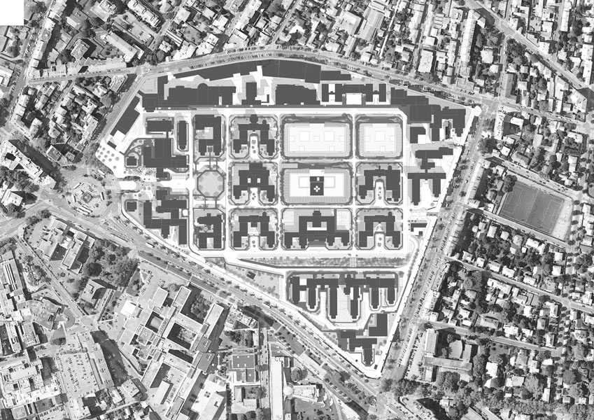 Autre axe développé : nous souhaitons mettre en harmonie les pavillons entre eux par un système de sols unifiés basé sur la logique des cadres d’origine. L'unification du paysage se fait par des sols coordonnés. Nous souhaitions souligner le paysage historique par de nouveaux cadres végétaux « en vibration ». De nouveaux cadres de sols seraient aménagés, en reconquête sur les largeurs trop importantes des chaussées, dégagées des stationnements. En rendant plus étroites les chaussées nous évitons tout stationnement sauvage. De nouveaux rubans en périphérie des pavillons apparaissent. Ces rubans seraient essentiellement fertiles, plantés de manière rase, avec des contours libres ceci permettant de faire les variations nécessaires pour l’intégration des nouveaux usages (dépose minute).