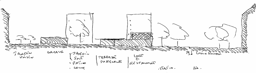 Tout d’abord par la coupe elle-même : les étages s’enchaînent par demi-niveaux. Par un tiers et deux tiers plus exactement afin de privilégier le rapport de deux pièces par strates : le séjour et sa mezzanine, les 2 chambres d’enfants, le séjour haut et la chambre des parents. Enfin un patio couronne l’ensemble associant la buanderie et une terrasse de jeu protégé des vues et du vent.