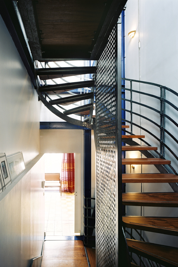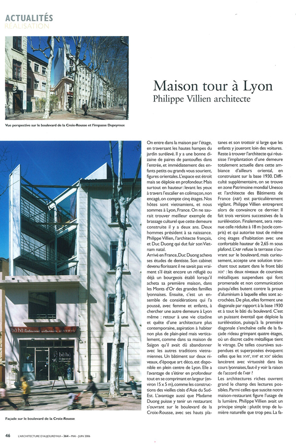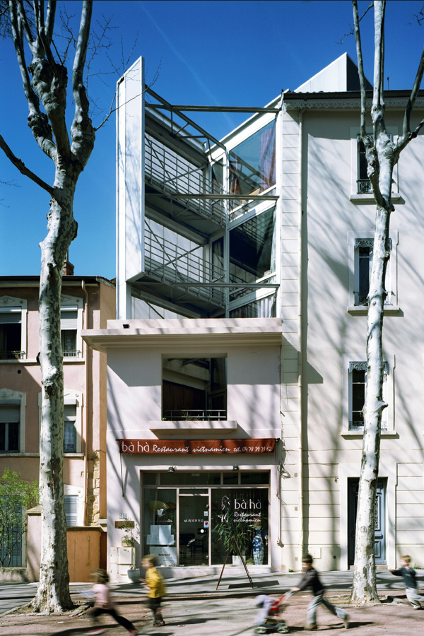 La réalisation de cette maison et de ce restaurant à Lyon est pour nous comme un véritable laboratoire. En effet le sujet est complexe : sur une base construite dans les années 1930, le programme de l’habitation se développe franchement à la verticale : 5 niveaux. Ce «quintuplex» s’étage en demi-niveau afin de rendre fluides l’ascension des niveaux. L’escalier est une pièce maîtresse de la maison. Il a été préfabriqué entièrement à Ho-Chi-Minh au Vietnam. Nous avons effectué deux voyages là-bas afin de suivre la fabrication de la serrurerie et d’importer environ 25 % des composants de la maison (garde-corps, persiennes, carrelage béton, cage d’escalier complète sur les 5 niveaux). Cette «mondialisation» de la maison est ici à comprendre par la recherche d’une certaine émotion issue de la réminiscence des souvenirs d’enfance du maître d’ouvrage. Son passé de boat people des années 1980, ayant acquis la culture française et un métier passionnant et confortable depuis, joue ici un rôle considérable.