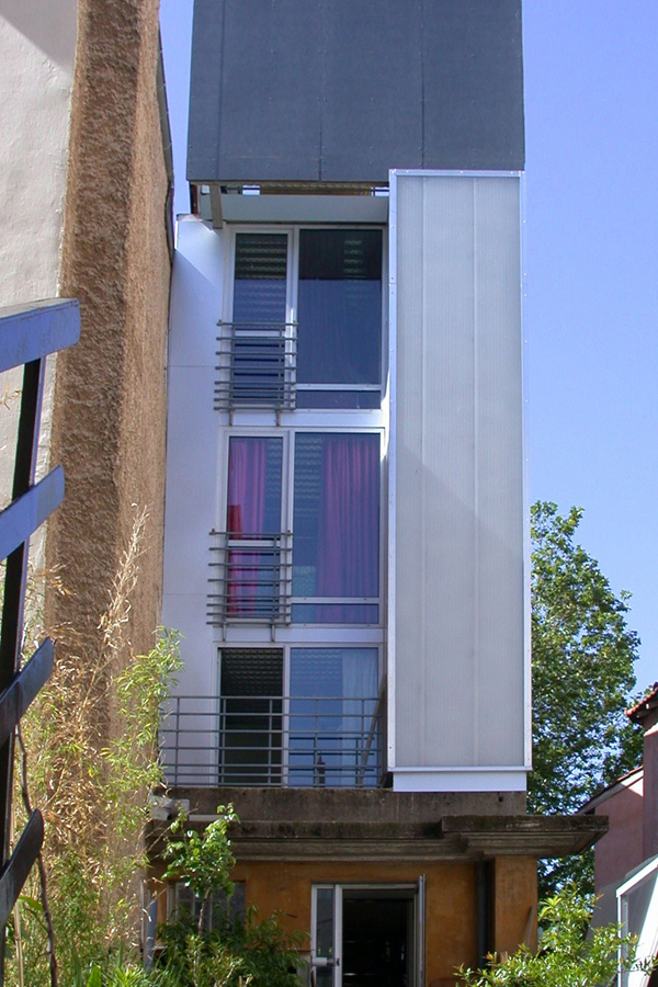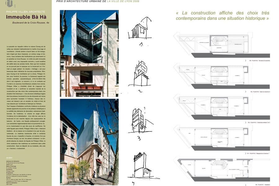"A obtenu le Prix d'Architecture Urbaine de Lyon en 2005. Rare exemple de densification de parcelle en milieu urbain dense et protégé (ZPPAUP). Projet à l’écriture résolument contemporaine (ossature acier, bardage polycarbonate, panneaux en tôle aluminium naturel) parfaitement inséré dans son environnement.