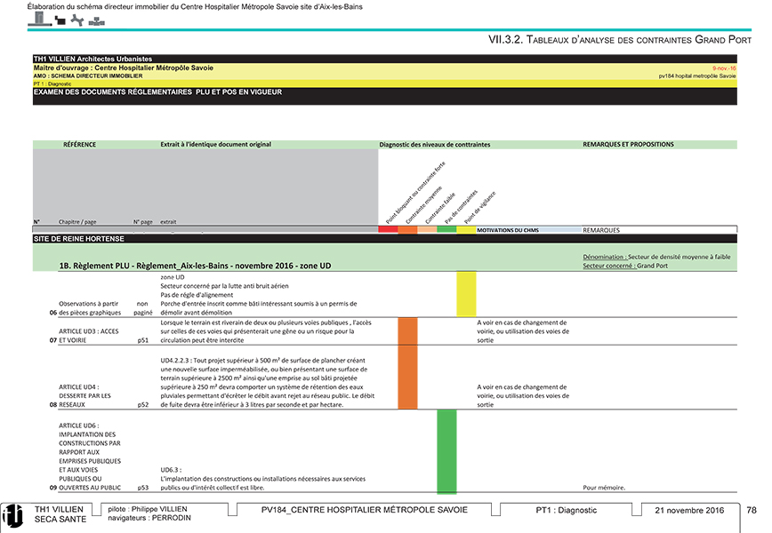 Le site très dense du centre ville est étudié en détail afin de tester sa capacité à être renouveler progressivement en de nombreuses phases, avec une orientation "SSR et gérontologie" marquée.