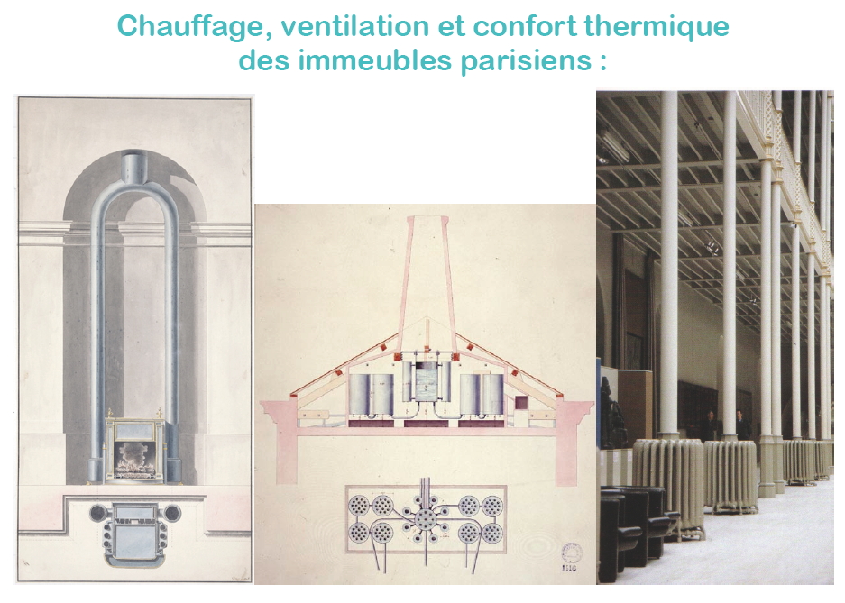 Des axes principaux permettront de développer notre propos : les sources d’énergie au fil du temps à Paris, la ville consommatrice de sa propre énergie (l’auto-énergie), le chauffage, la ventilation, le confort thermique des édifices parisiens, l’immeuble dans sa verticalité (le rôle des caves et des combles), les parois des bâtiments.