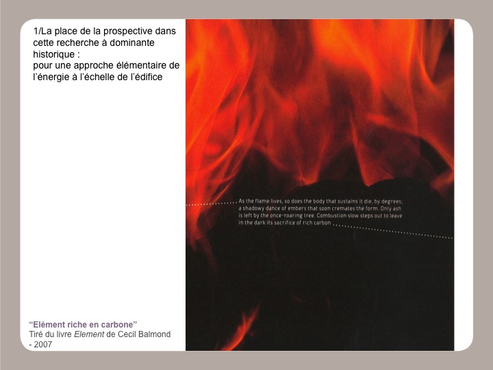 Nous partirons de questions énergétiques bien entendu mais en nous replaçant dans une sorte particulière de synthèse architecturale : l’énergie ici sera entendue comme « originelle », c’est à dire en tant « qu’élément ».
