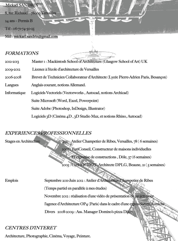 Mickael Sandrin effectue son stage de Master Recherche d'Architecture. Il est en contrat avec le laboratoire de recherche IPRAUS, installé à l'Ecole d'Architecture de Paris Belleville. Il travaille sur la recherche "IGNIS MUTAT RES - IMR" programme faisant partie des actions de l'AIGP (Atelier International du Grand Paris), du PUCA et soutenue par la Ville de Paris. L'intitulé de cette recherche est "Histoire et Prospective d'une Capitale Econome - HPCE". Commanditaires : Ministère de la Culture et de la Communication (MCC) Direction générale des patrimoines (DGP) Bureau de la recherche architecturale, urbaine et paysagère (BRAUP) Ministère de l’Écologie, du Développement durable, des Transports et du Logement (MEDDTL). Sujet : recherche sur les nouveaux paysages de l'énergie dans le Grand Paris. Le travail consiste en des recherches documentaires sur les différentes énergies disponibles, sur les développements prospectifs sur chacunes d'elles. Un travail très fin de dessins, de cartographie et de diagrammes est effectué à différentes échelles, de l'échelle de la Ville de Paris à celles des équipements patrimoniaux étudiés.